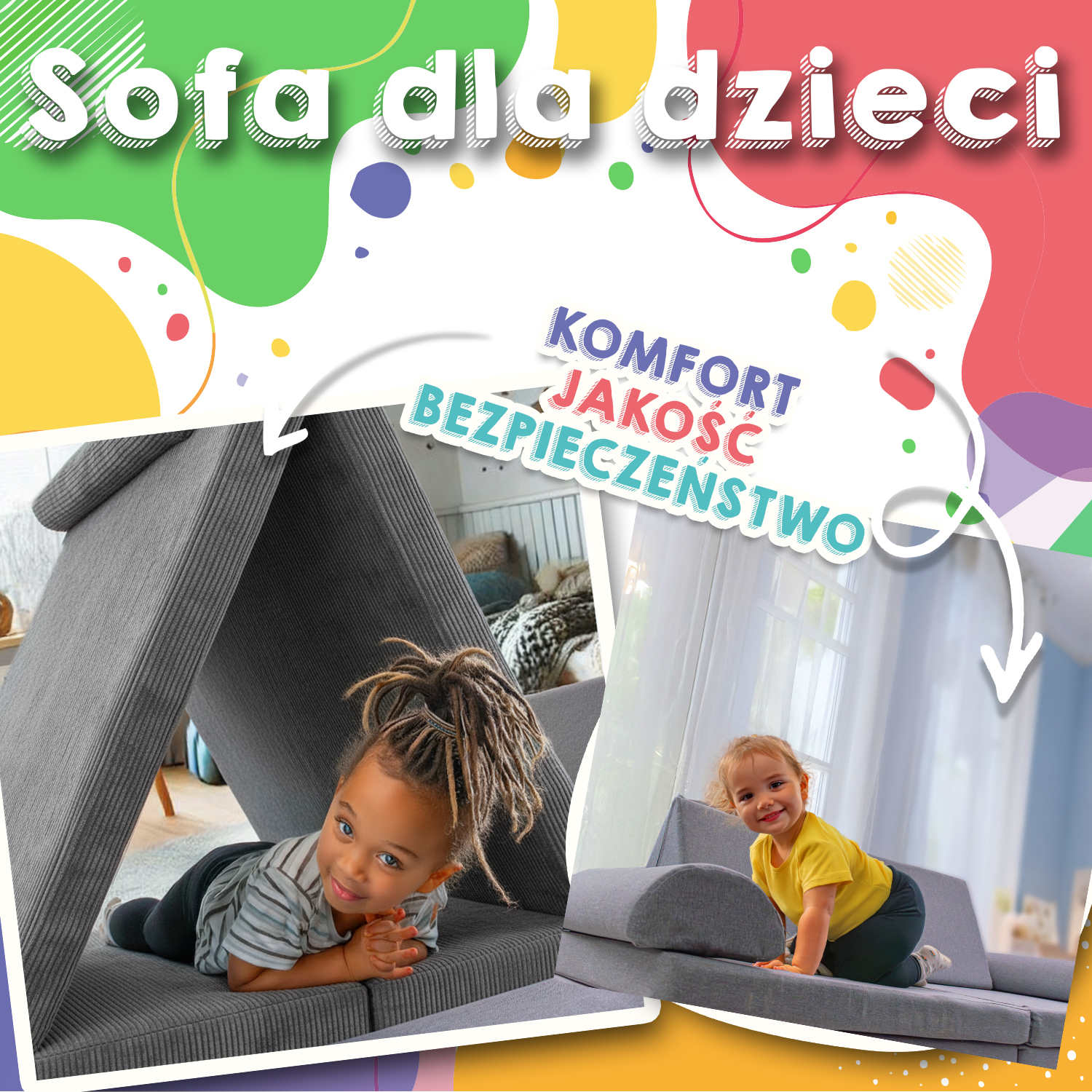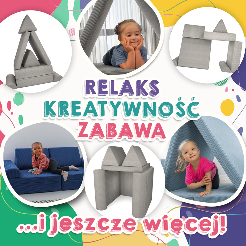 Modułowa konstrukcja sofy daje dziecku swobodę tworzenia własnych przestrzeni do zabawy. Poszczególne elementy można łatwo przestawiać, łączyć i rozdzielać, tworząc fotele, leżanki, tunele, kryjówki czy proste konstrukcje przypominające domki. Brak sztywnych połączeń sprawia, że dziecko samo decyduje o formie zabawy i uczy się planowania przestrzennego. Lekka forma elementów pozwala na samodzielne użytkowanie nawet przez młodsze dzieci. Sofa sprawdza się nie tylko jako mebel, ale jako narzędzie do rozwijania kreatywności, wyobraźni i motoryki. Jednego dnia jest miejscem zabawy, drugiego bazą do kreatywnych konstrukcji, a później wygodnym miejscem do odpoczynku, wszystko w jednym zestawie.
