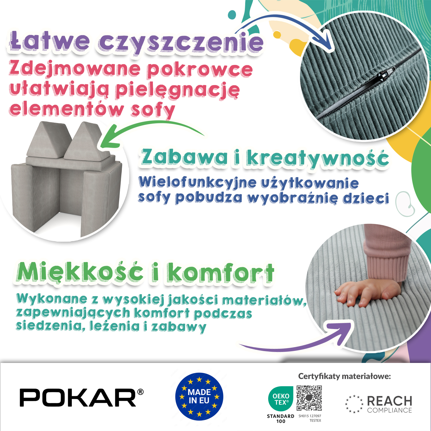 Każdy zestaw modułowej sofy dziecięcej POKAR zawiera 6 elementów: dwa materace (160x80x8 cm i 160x80x15 cm), dwie trójkątne poduszki oraz dwa półwałki. To idealne połączenie do tworzenia różnych układów do siedzenia, spania i zabawy, które można dowolnie przestawiać i dopasowywać do potrzeb dziecka.Sofa modułowa POKAR to świetne rozwiązanie do pokoju dziecięcego. Dla wygodnego i mobilnego rozwiązania warto zobaczyć nasze materace składane POKAR, które idealnie sprawdzą się zarówno podczas drzemki, kreatywnej zabawy, jak i w podróży.