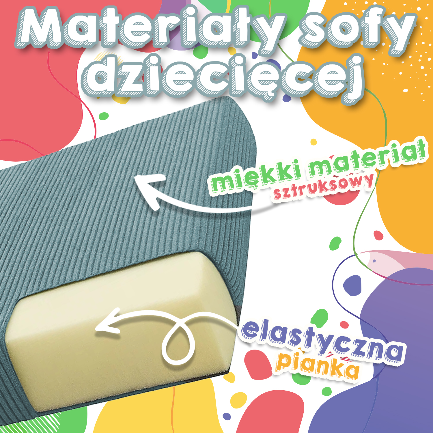 Miękki sztruks typu corduroy to materiał, który od pierwszego dotyku daje poczucie komfortu i jakości. Wyraźna, prążkowana faktura nie tylko wygląda atrakcyjnie, ale również zapewnia przyjemne doznania sensoryczne, ważne zwłaszcza w codziennym użytkowaniu przez dzieci. Tkanina jest ciepła, delikatna dla skóry i nie powoduje uczucia chłodu, dzięki czemu sofa sprawdza się o każdej porze roku. Zastosowany sztruks charakteryzuje się wysoką odpornością na ścieranie i intensywne użytkowanie. Nie mechaci się i zachowuje estetyczny wygląd nawet przy częstym siadaniu, leżeniu czy wspinaniu się po elementach. To materiał stworzony z myślą o dziecięcej aktywności, który łączy trwałość z miękkością, a jednocześnie dobrze prezentuje się w nowoczesnych wnętrzach.
