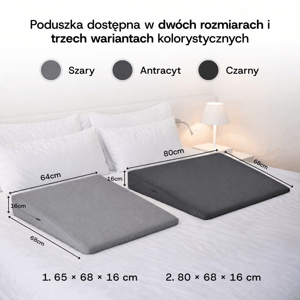 Poduszka klinowa 65x68x16 cm w kolorze szarym zapewnia stabilne podparcie pleców, karku lub nóg podczas odpoczynku, czytania i oglądania TV. Dzięki piance T25 pomaga utrzymać wygodną, podwyższoną pozycję ciała, wspierając komfort przy refluksie, zgadze i zmęczonych nogach. Zdejmowany pokrowiec z zamkiem można prać w 40°C.