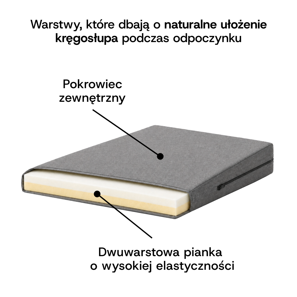 Komfortowa poduszka z dwóch warstw pianki: miękkiej visco memory, która dopasowuje się do ciała i redukuje ucisk, oraz sprężystej pianki T25 zapewniającej stabilne podparcie. Zachowuje kształt, nie odkształca się i wspiera cyrkulację powietrza.
